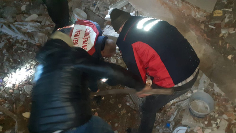 Gümüşhane’den 9 kişiyle deprem bölgesi olan Adıyaman’a giden İtfaiye ekibi sabaha karşı Malazgirt Mahallesi 1071 Sokak’ta dinleme çalışmaları sırasında 5 katlı apartman enkazından ses duyunca çalışmalara başladı.