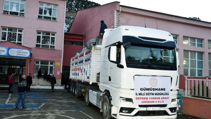Bu kapsamda Gümüşhane Valiliği koordinesinde İl Milli Eğitim Müdürlüğü tarafından depremden etkilenen vatandaşlara ulaştırılmak üzere 1 tır dolusu su ve battaniye Kilis’e ulaştırıldı.