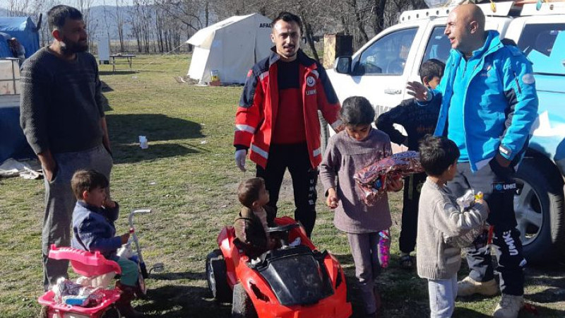 Geçtiğimiz hafta Sağlık-Sen Gümüşhane Şubesi'nin destek verdiği oyuncak kampanyası ile sağlık çalışanlarının topladığı oyuncaklar depremin ilk anından beri bölgede bulunan Gümüşhane UMKE ekipleri tarafından Nurdağı ilçesinin kırsal kesimindeki çocuklara dağıtıldı.