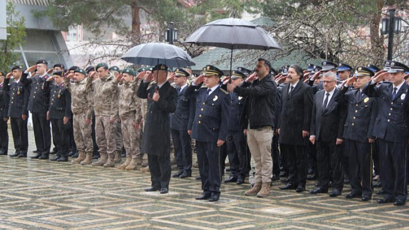 Yoğun yağmur yağışı altında gerçekleştirilen törende İl Emniyet Müdürü Taner Cömert, anıta çelenk sunduktan sonra saygı duruşunda bulunuldu ve İstiklal Marşı okundu.