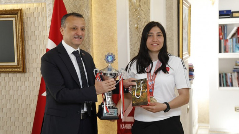 Gümüşhane Valisi Kamuran Taşbilek, İstanbul'da yapılan 8. Turkish Open WAKO Dünya Kupası'nda 56 kilogramda tüm rakiplerini yenerek şampiyon olan milli sporcu Feyzanur Azizoğlu ve antrenörler